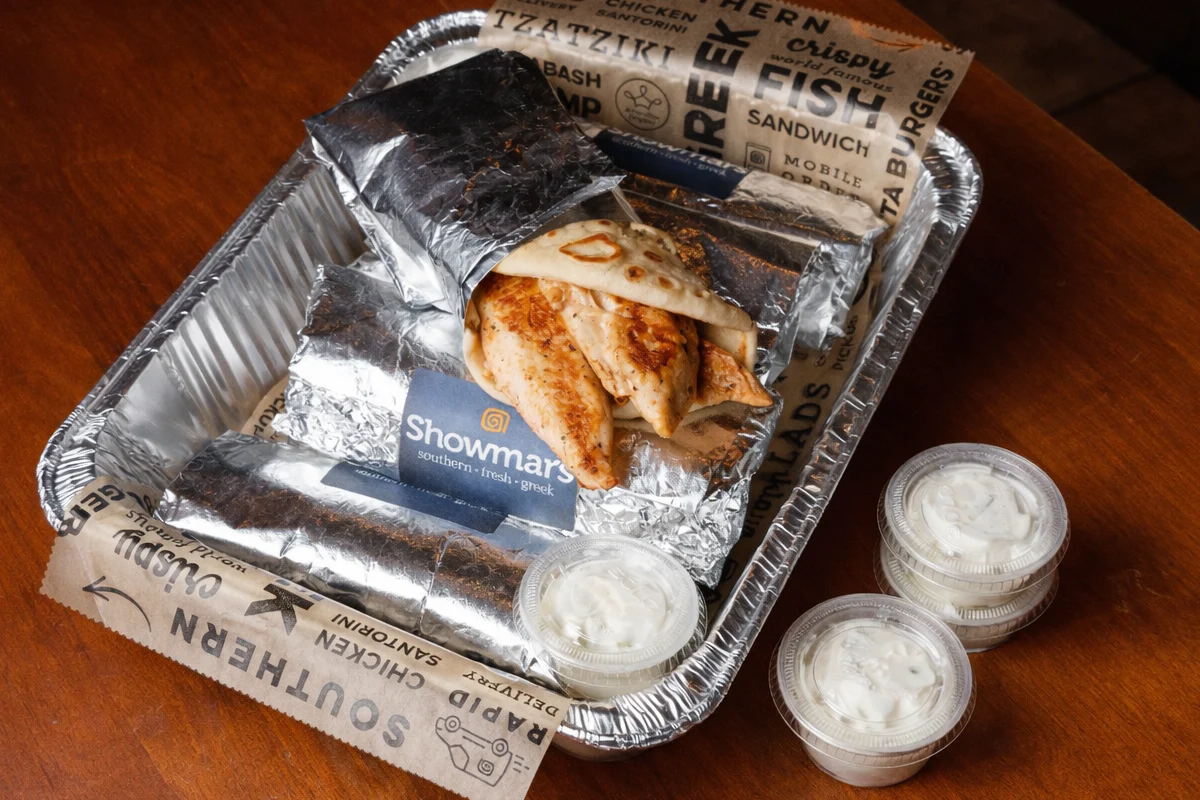 A SIX-PACK OF GRAB AND GO WARM PITAS FILLED WITH GRILLED CHICKEN AND TZATZIKI ON THE SIDE